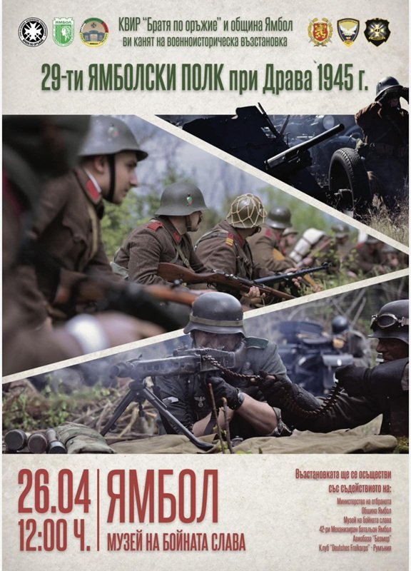 Най-новите експонати на Музея на бойната слава в Ямбол – СУ-100 и Т-34, ще участват във възстановка на настъпателните действия на 29-и ямболски пехотен полк край Драва. Събитията от Втората световна война ще бъдат пресъздадени на 26 април от 12:00 часа в двора на ямболския музей от клуба за военно исторически реконструкции „Братя по оръжие“ по покана на Община Ямбол. В организацията се включват също Авиобаза Безмер и 42 механизиран батальон – Ямбол, които ще предложат на посетителите безплатен войнишки боб.