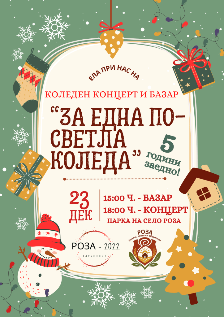 Тунджанското село Роза ще се превърне в най-коледното място в област Ямбол за пети пореден път на 23 декември, когато ще се осъществи юбилейното издание на най-чаканото събитие в родното село – Коледен концерт и базар „За една по-светла Коледа“, тази година под наслов „Пет години заедно“.